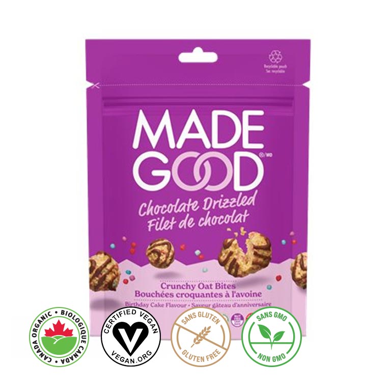 Pure gluten-free oats*, Sugars* (cane sugar*, invert cane sugar*), Palm fruit oil*+, Sprinkles* (rice crisps* [rice flour*, cane syrup*, salt), Vegetable glycerin*, Sunflower oil*, Beet red powder*, Purple sweet potato powder [maltodextin, purple sweet potato extract, citric acid], spirulina extract*), Chocolate* (cane sugar*, unsweetened chocolate*, cocoa butter*), Sunflower oil*, Natural flavours*, Sea salt, Vegetable extract (spinach, broccoli, carrots, tomatoes, beets, shiitake mushrooms)